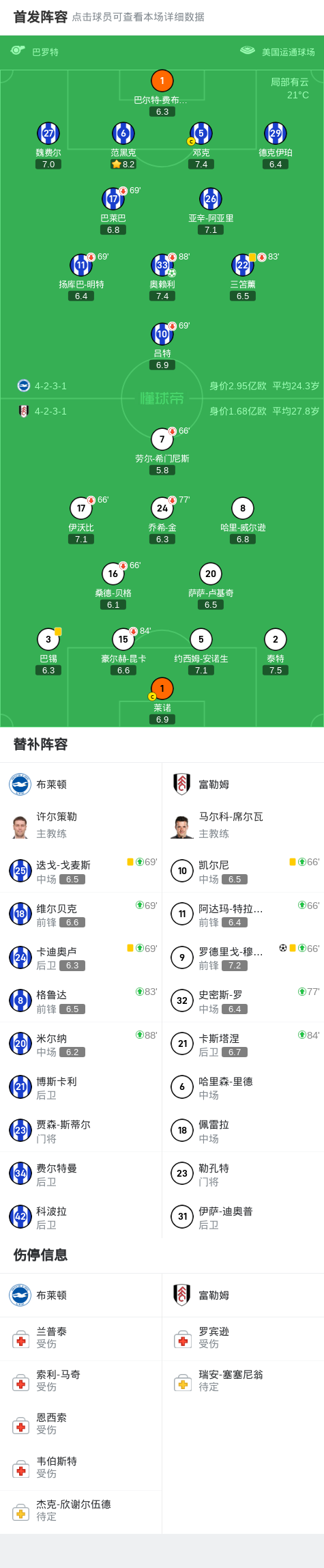 在本场英格兰足球顶级联赛的第1轮比赛中,布莱顿与富勒姆展开了激烈的对决。比赛一开始,双方球员士气高涨,迎着观众的欢呼声,迅速进入了正常的比赛节奏。比赛进行到第4分钟时,布莱顿球员明特的进球被判无效,让双方球迷为之一惊。